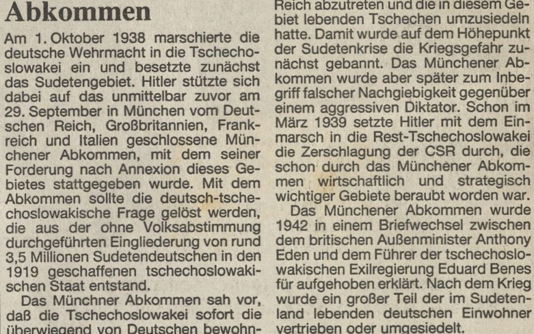 Das Münchener Abkommen sah vor, daß die Tschechoslowakei sofort die überwiegend von Deutschen bewohnten Grenzgebiete Böhmens mit fast vier Millionen Einwohnern an das Deutsche Reich abzutrenten und die in diesem Gebiet lebenden Tschechen umzusiedeln hatte. Damit wurde auf dem Höhepunkt der Sudentenkrise die Kriegsgefahr zunächst gebannt. Das Münchener Abkommen wurde aber später zum Inbegriff falscher Nachgiebigkeit gegenüber einem aggressiven Diktator. Schom im März 1939 setzte Hitler mit dem Einmarsch in die Rest-Tschechoslowakei die Zerschlagung der CSR durch, die schon durch das Münchener Abkommen wirtschaftlich und strategisch wichtiger Gebiete beraubt worden war.