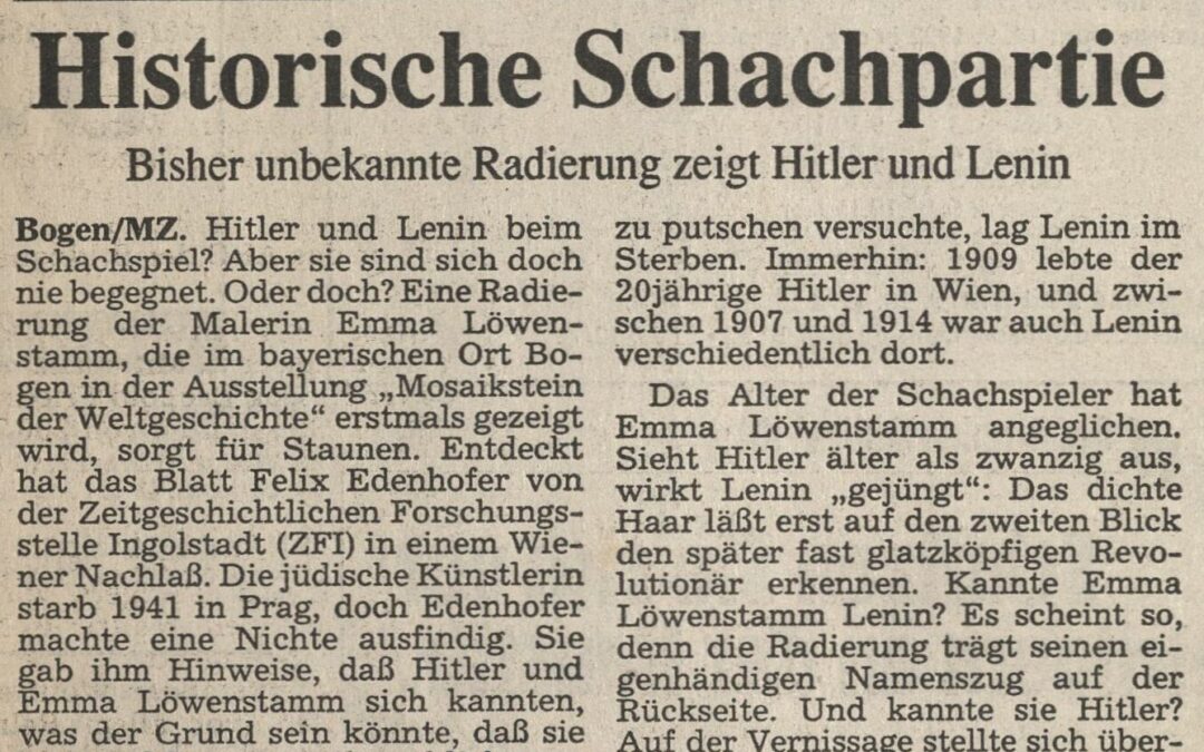 Bogen/MZ. Hitler und Lenin beim Schachspiel? Aber sie sind sich doch nie begegnet. Oder doch? Eine Radierung der Malerin Emma Löwenstamm, die im bayerischen Ort Bogen in der Ausstellung „Mosaikstein der Weltgeschichte“ erstmals gezeigt wird, sorgt für Staunen. Entdeckt hat das Blatt Felix Edenhofer von der Zeitgeschichtlichen Forschungsstelle Ingolstadt (ZFI) in einem Wiener Nachlaß. Die jüdische Künstlerin starb 1941 in Prag, doch Edenhofer machte eine Nichte ausfindig. Sie gab ihm Hinweise, daß Hitler und Emma Löwenstamm sich kannten, was der Grund sein könnte, daß sie von Verfolgung verschont blieb.