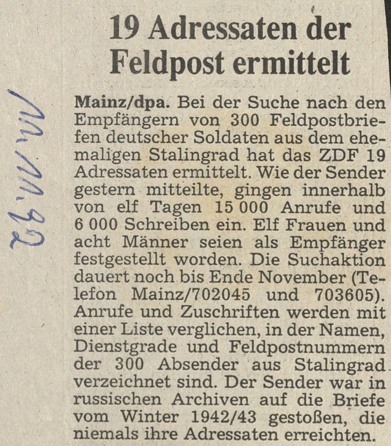Bei der Suche nach den Empfängern von 300 Feldpostbriefen deutscher Soldaten aus dem ehemaligen Stalingrad hat das ZDF 19 Adressaten ermittelt. Wie der Sender gestern mitteilte, gingen innerhalb von elf Tagen 15 000 Anrufe und 6 000 Schreiben ein. Elf Frauen und acht Männer seien als Empfänger festgestellt worden. Die Suchaktion dauert noch bis Ende November (Telefon Mainz/702045 und 703605). Anrufe und Zuschriften werden mit einer Liste verglichen, in der Namen, Dienstgrade und Feldpostnummern der 300 Absender aus Stalingrad verzeichnet sind. Der Sender war in russischen Archiven auf die Briefe vom Winter 1942/43 gestoßen, die niemals ihre Adressaten erreichen.