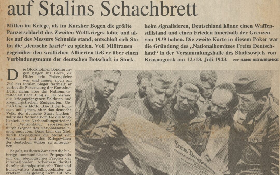 Mitten Kriege, als im Kursker Bogen die größte Panzerschlacht des Zweiten Weltkrieges tobte und alles auf des Messers Schneide stand, entschloß sich Stalin die „deutsche Karte“ zu spielen. Voll Mißtrauen gegenüber den westlichen Alliierten ließ er über einen Verbindungsmann der deutschen Botschaft in Stockholm signalisieren, Deutschland könne einen Waffenstillstand und einen Frieden innerhalb der Grenzen von 1939 haben. Die zweite Karte in diesem Poker war die Gründung des „Nationalkomitees Freies Deutschland“ in der Versammlungshalle des Stadtsowjets von Krasnogorsk am 12./13. Juli 1943.