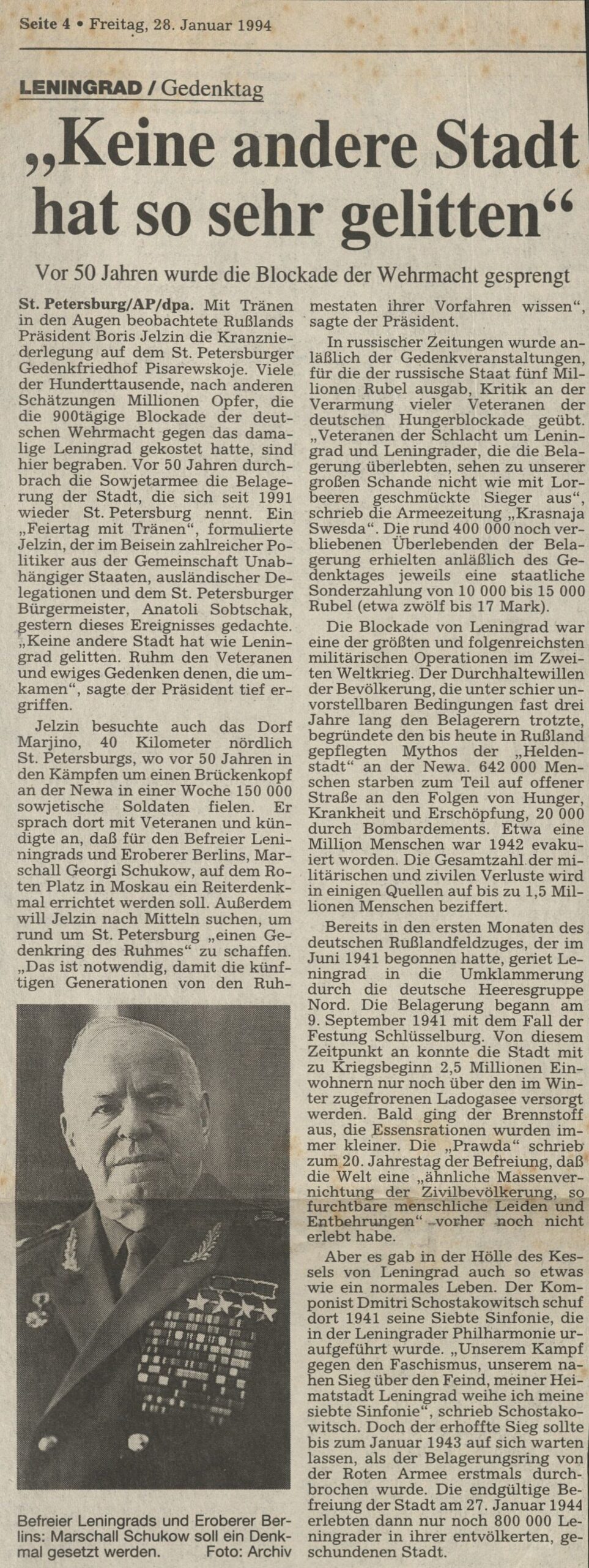 Jelzin besuchte auch das Dorf Marjino, 40 Kilometer nördlich St. Petersburg, wovor 50 Jahren in den Kämpfen um einen Brückenkopf an der Newa in einer Woche 150 000 sowjetische Soldaten fielen. Er sprach dort mit Veteranen und kündigte an, daß für den Befreier Leningrads und Eroberer Berlins, Marschall Georgi Schukow, auf dem Roten Platz in Moskau ein Reiterdenkmal errichtet werden soll. Außerdem will Jelzin nach Mitteln suchen, um rund um St. Petersburg „einen Gedenkring des Ruhmes“ zu schaffen. „Das ist notwendig, damit die künftigen Generationen von den Ruhmestaten ihrer Vorfahren wissen“, sagte der Präsident.