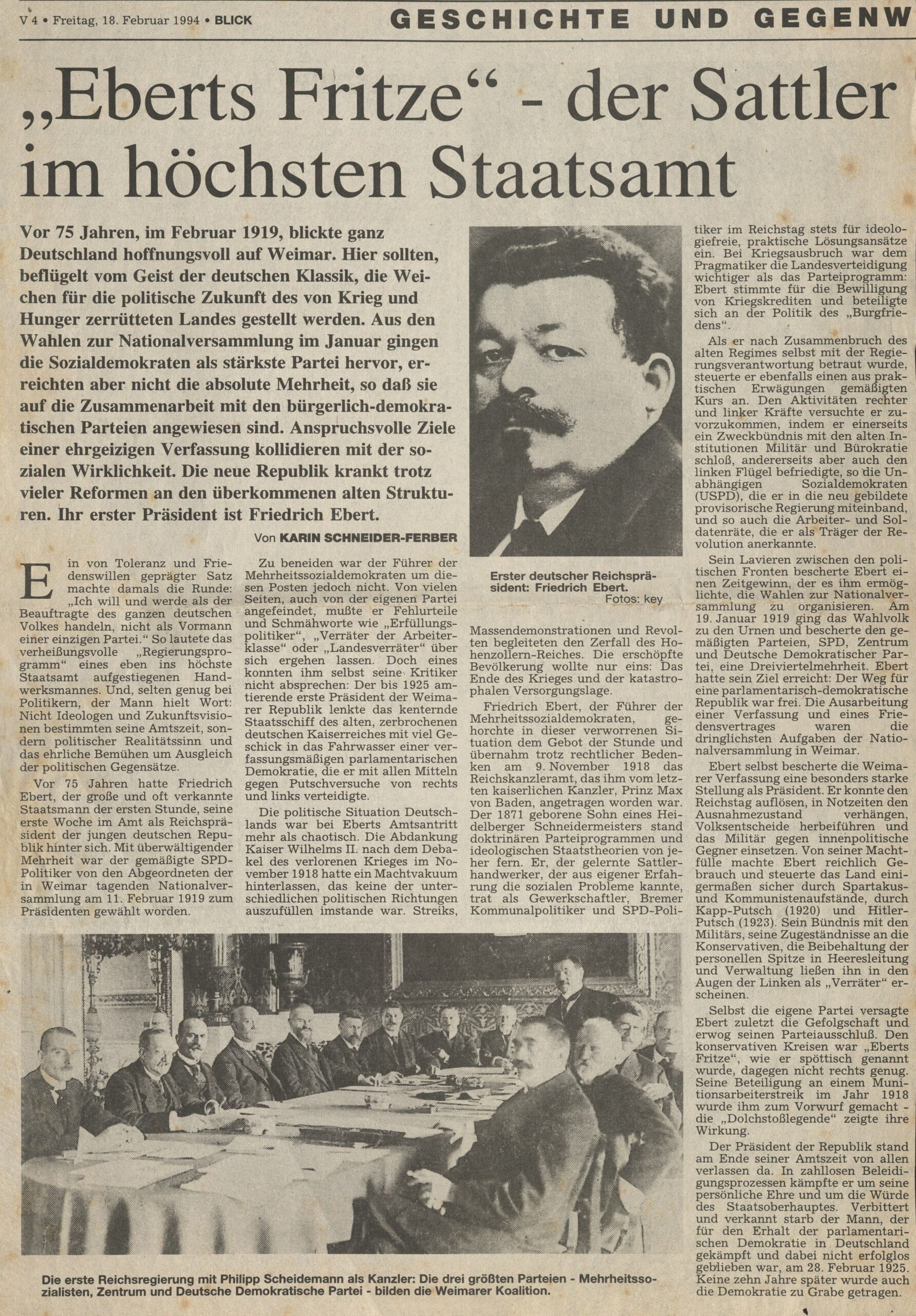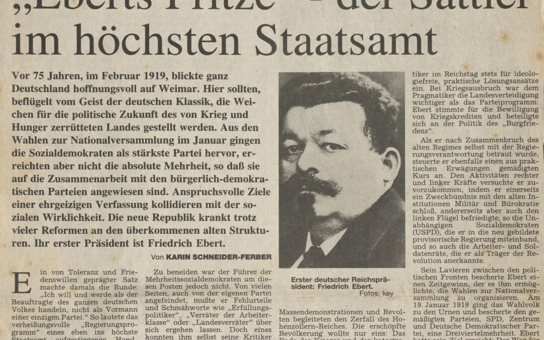 Vor 75 Jahren hatte Friedrich Ebert, der große und oft verkannte Staatsmann der ersten Stunde, seine erste Woche im Amt als Reichspräsident der jungen deutschen Republik hinter sich. Mit überwältigender Mehrheit war der gemäßigte SPD-Politiker von den Abgeordneten der in Weimar tagenden Nationalversammlung am 11. Februar 1919 zum Präsidenten gewählt worden.