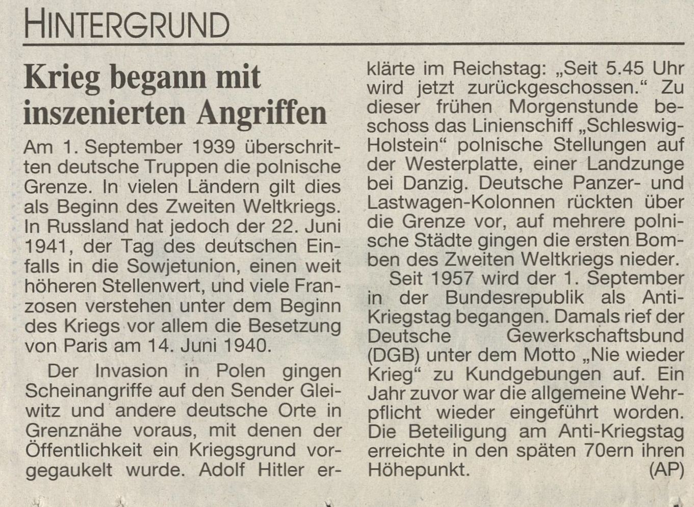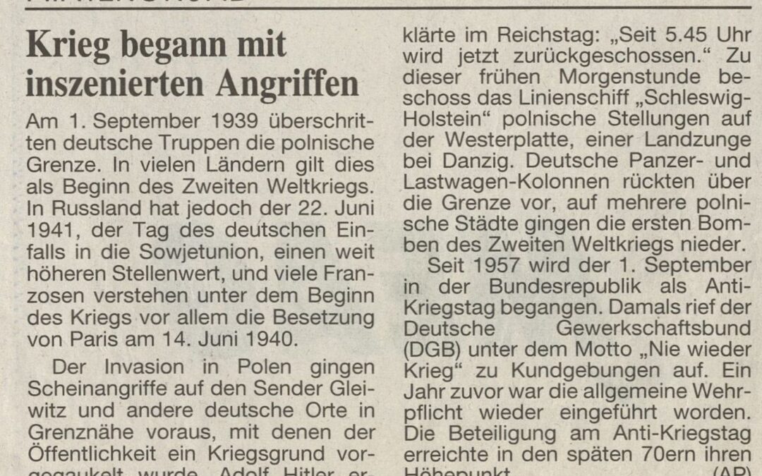 Der Invasion in Polen gingen Scheinangriffe auf den Sender Gleiwitz und andere deutsche Orte in Grenznähe voraus, mit denen der Öffentlichkeit ein Kriegsgrund vorgegaukelt wurde. Adolf Hitler erklärte im Reichstag: „Seit 5.45 Uhr wird jetzt zurückgeschossen.“ Zu dieser frühen Morgenstunde beschoss das Linienschiff „Schleswig-Holstein“ polnische Stellungen auf der Westerplatte, einer Landzunge bei Danzig. Deutsche Panzer- und Lastwagen-Kolonnen rückten über die Grenze vor, auf mehrere polnische Städte gingen die ersten Bomben des Zweiten Weltkrieges nieder.