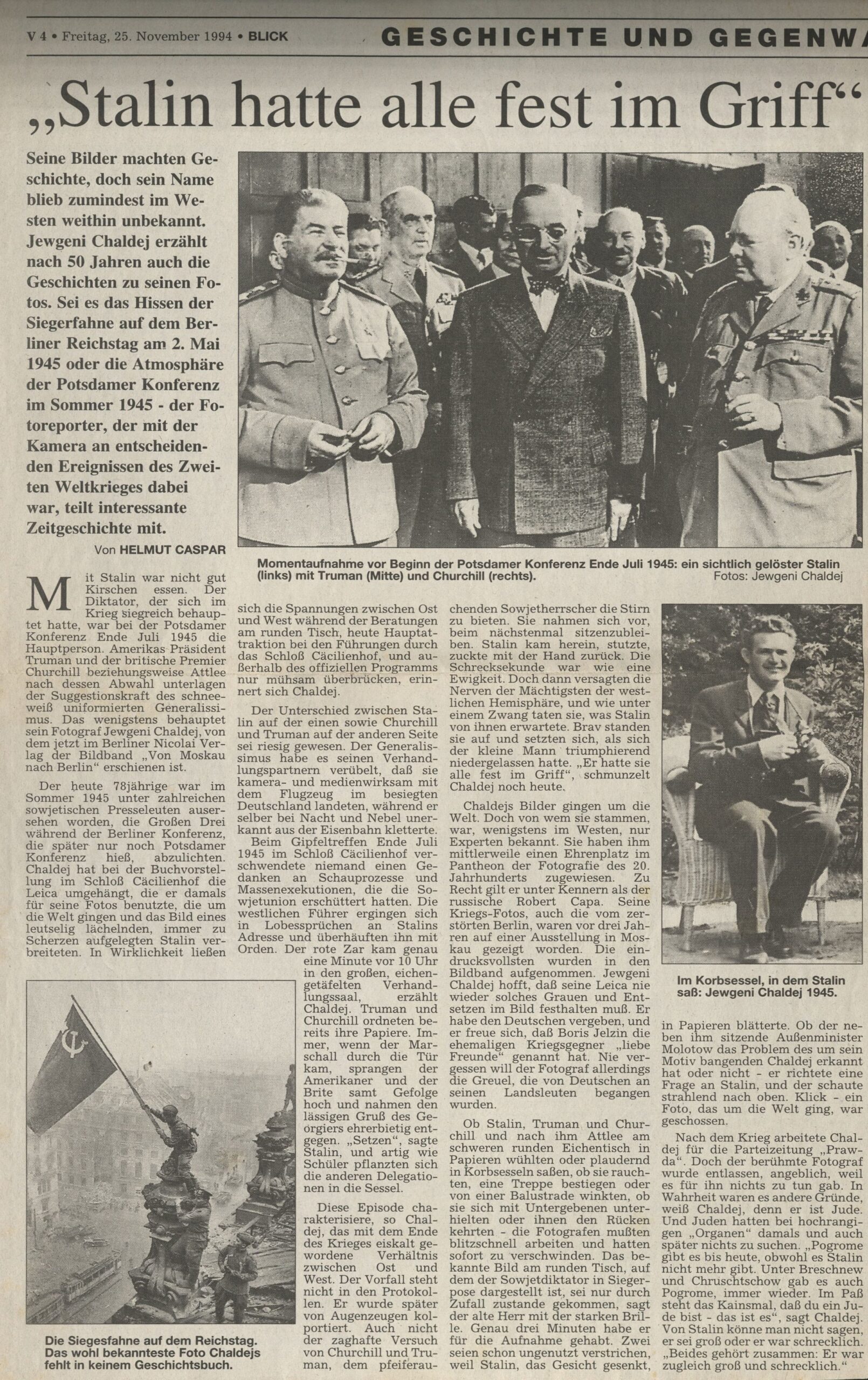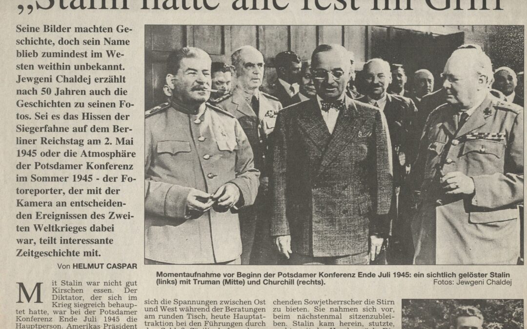 Ob Stalin, Truman und Churchill und nach ihm Attlee am schweren runden Eichentisch in Papieren wühlten oder plaudernd in Korbsesseln saßen, ob sie rauchten, eine Treppe bestiegen oder von einer Balustrade winkten, ob sie sich mit Untergebenen unterhielten oder ihnen den Rücken kehrten – die Fotografen mußten blitzschnell arbeiten und hatten sofort zu verschwinden. Das bekannte Bild am runden Tisch, auf dem der Sowjetdiktator in Siegerpose dargestellt ist, sei nur durch Zufall zustande gekommen, sagt der alte Herr mit der starken Brille. Genau drei Minuten habe er für die Aufnahme gehabt. Zwei seien schon ungenutzt verstrichen, weil Stalin, das Gesicht gesenkt, in Papieren blättert. Ob der neben ihm sitzende Außenminister Molotow das Problem des um sein Motiv bangenden Chaldej erkannt hat oder nicht – er richtete eine Frage an Stalin, und der schaute strahlend nach oben. Klick – ein Foto, das um die Welt ging, war geschossen.