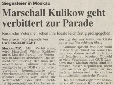 An diesem Morgen war Lenins Name, den meisten teuer, auf dem Mausoleum verhängt. Über diesem Tuch stand ein verachteter Minister und General, der ihren Festtag durch provozierende Tolpatschigkeit im Föderationsstaat Tschetschenien weltweit zum Zankapfel gemacht hatte. Ein Präsident, dem man aus demselben und anderen Gründen nicht mehr traute. Und dort, wo früher die sowjetischen Minister Platz fanden, standen die Lenker der USA und Englands, die den einstigen sowjetischen Alliierten vom Jahrestage der Normandie-Invasion ausgeschlossen und den Sieg so quasi zu einem angelsächsischen Unternehmen gemacht hatten. Auch dieser unverständigen und fremdgewordenen Welt, welche ihnen die Einzigartigkeit ihres Heldentums nicht mehr danken wollte, galt der Schulterschluß der Veteranen.