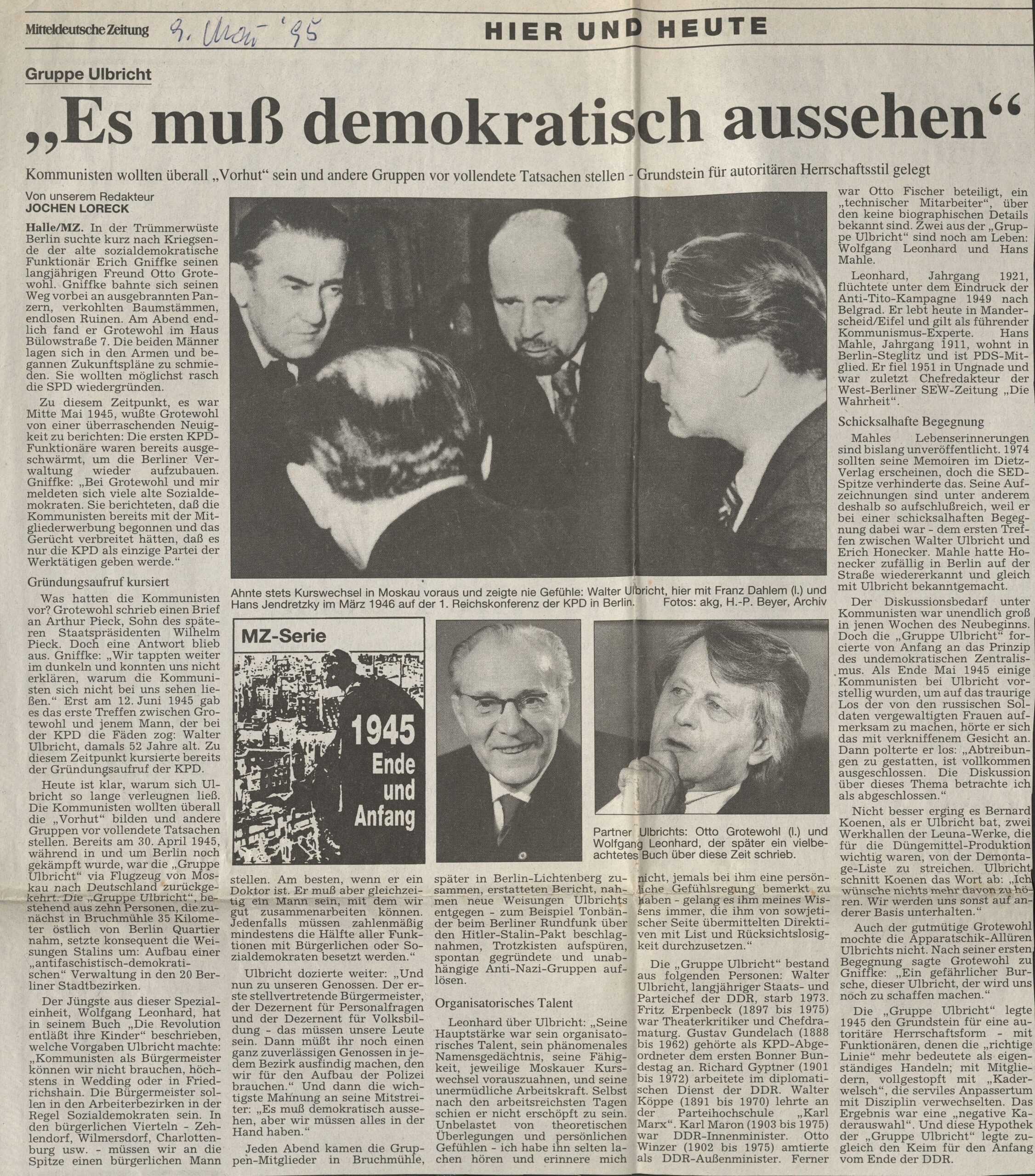 Der Jüngste aus dieser Spezialeinheit, Wolfgang Leonhard, hat in seinem Buch „Die Revolution entläßt ihre Kinder“ beschrieben, welche Vorgaben Ulbricht machte: “Kommunisten als Bürgermeister können wir nicht brauchen, höchstens in Wedding oder in Friedrichshain. Die Bürgermeister sollen in den Arbeiterbezirken in der Regel Sozialdemokraten sein. In den bürgerlichen Vierteln – Zehlendorf, Wilmersdorf, Charlottenburg usw. – müssen wir an die Spitze einen bürgerlichen Mann stellen. Am besten, wenn er ein Doktor ist. Er muß aber gleichzeitig ein Mann sein, mit dem wir gut zusammenarbeiten können. Jedenfalls müssen zahlenmäßig mindestens die Hälfte aller Funktionen mit Bürgerlichen oder Sozialdemokraten besetzt werden.“