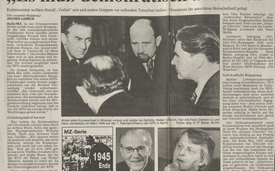 Halle/MZ. In der Trümmerwüste Berlin suchte kurz nach Kriegsende der alte sozialdemokratische Funktionäre Erich Grniffke seinen langjährigen Freund Otto Grotewohl. Gniffke bahnte sich seinen Wegvorbei an ausgebrannten Panzern, verkohlten Baumstämmen, endlosen Ruinen. Am Abend endlich fand er Grotewohl im Haus Bülowstraße 7. Die beiden Männer lagen sich in den Armen und begannen Zukunftspläne zu schmieden. Sie wollten möglichst rasch die SPD wiedergründen.