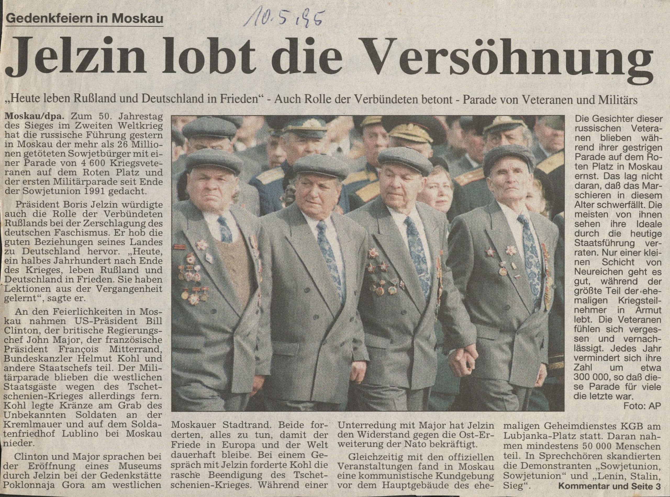 Clinton und Major sprachen bei der Eröffnung eines Museums durch Jelzin bei der Gedenkstätte Poklonnaja Gora am westlichen Moskauer Stadtrand. Beide forderten, alles zu tun, damit der Friede in Europa und der Welt dauerhaft bleibe. Bei einem Gespräch mit Jelzin forderte Kohl die rasche Beendigung des Tschetschenien-Krieges. Während einer Unterredung mit Major hat Jelzin den Widerstand gegen die Ost-Erweiterung der Nato bekräftigt.