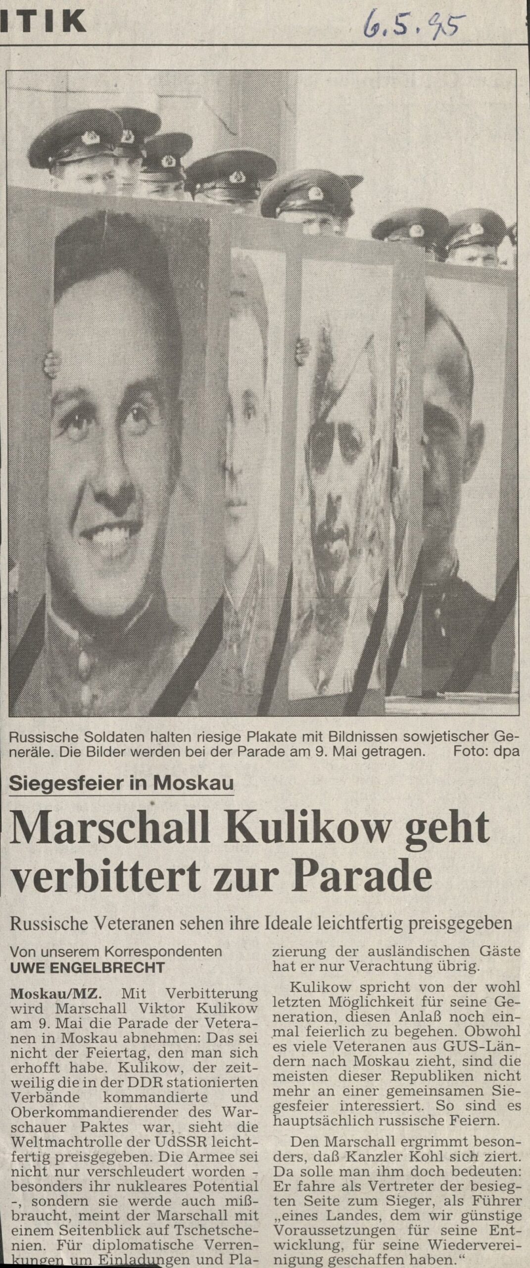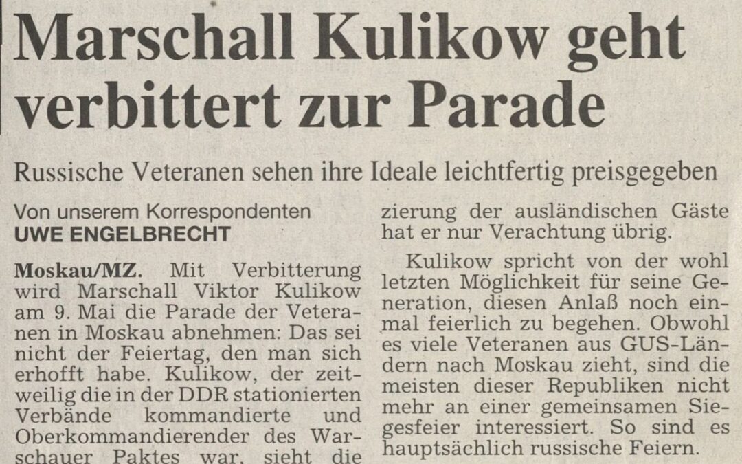 Mit Verbitterung wird Marschall Viktor Kulikow am 9. Mai die Parade der Veteranen in Moskau abnehmen: Das sei nicht der Feiertag, den man sich erhofft habe. Kulikow, der zeitweilig die in der DDR stationierten Verbände kommandierte und Oberkommandierender des Warschauer Paktes war, sieht die Weltmachtrolle der UdSSR leichtfertig preisgegeben. Die Armee sei nicht nur verschleudert worden – besonders ihr nukleares Potential – sondern sie werde auch mißbraucht, meint der Marschall mit einem Seitenblick auf Tschetschenien. Für diplomatische Verrenkungen um Einladungen und Plazierung der ausländischen Gäste hat er nur Verachtung übrig.