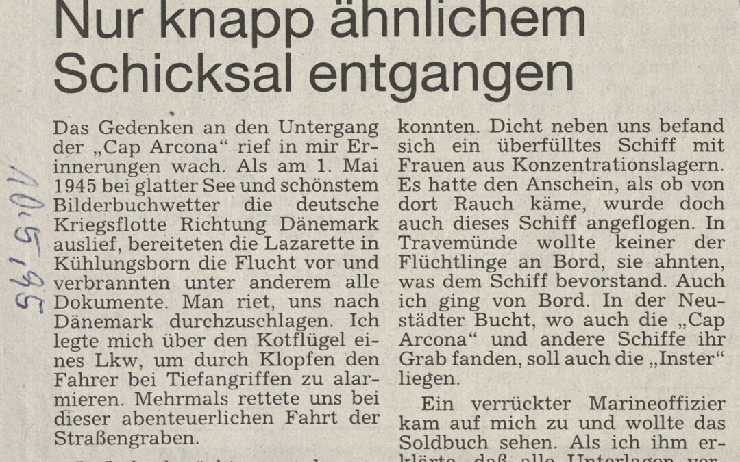 Das Gedenken an den Untergang der „Cap Arcona“ rief in mir Erinnerungen wach. Als am 1. Mai 1945 bei glatter See und schönstem Bilderbuchwetter die deutsche Kriegsflotte Richtung Dänemark auslief, bereiteten die Lazarette in Kühlungsborn die Flucht vor und verbrannten unter anderem alle Dokumente. Man riet, uns nach Dänemark durchzuschlagen. Ich legte mich über den Kotflügel eines Lkw, um durch Klopfen den Fahrer bei Tiefangriffen zu alarmieren. Mehrmals rettete uns bei dieser abenteuerlichen Fahrt der Straßengraben.