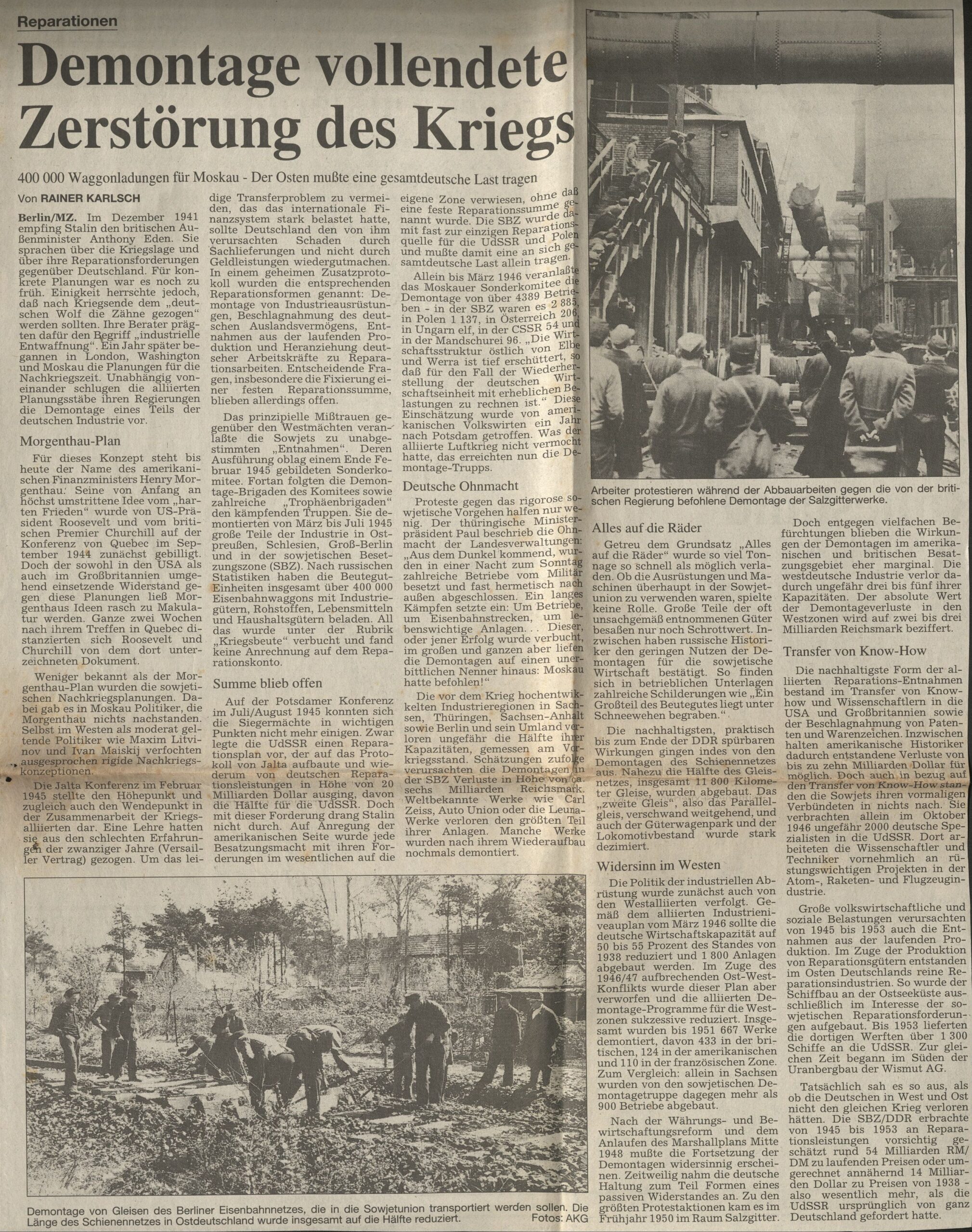 Tatsächlich sah es so aus, als ob die Deutschen in West und Ost nicht den gleichen Krieg verloren hatten. Die SBZ/DDR erbrachte von 1945 bis 1953 an Reparationsleistungen vorsichtig geschätzt rund 54 Milliarden RM/DM zu laufenden Preisen oder umgerechnet annähernd 14 Milliarden Dollar zu Preisen von 1938 – also wesentlich mehr, als die UdSSR ursprünglich von ganz Deutschland gefordert hatte.