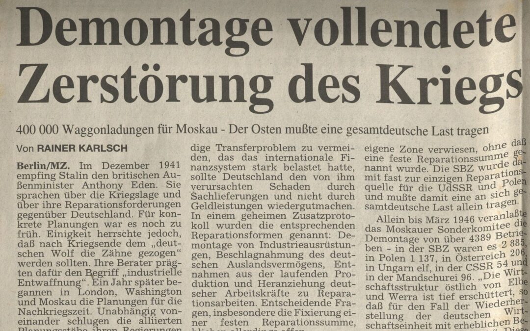 Berlin/MZ. Im Dezember 1941 empfing Stalin den britischen Außenminister Anthony Eden. Sie sprachen über die Kriegslage und über ihre Reparationsforderungen gegenüber Deutschland. Für konkrete Planungen war es noch zu früh. Einigkeit herrschte jedoch, daß nach Kriegsende dem „deutschen Wolf die Zähne gezogen“ werden sollten. Ihre Berater prägten dafür den Begriff „industrielle Entwaffnung“. Ein Jahr später begannen in London, Washington und Moskau die Planungen für die Nachkriegszeit. Unabhängig voneinander schlugen die alliierten Planungsstäbe ihren Regierungen die Demontage eines Teils der deutschen Industrie vor.