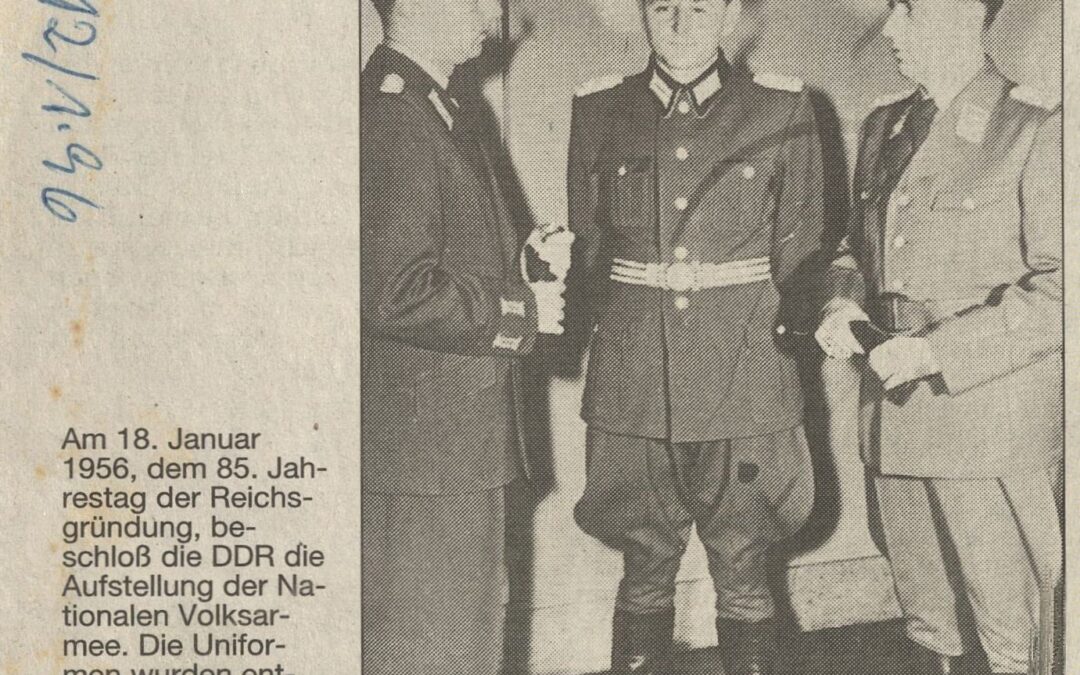 Bildunterschrift: Am 18. Januar 1956, dem 85. Jahrestag der Reichsgründung, beschloß die DDR die Aufstellung der Nationalen Volksarmee. Die Uniformen wurden entworfen nach Reichswehr- und Wehrmachtsvorbild.