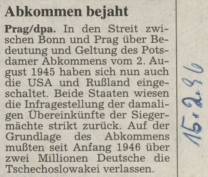 In den Streit zwischen Bonn und Prag über Bedeutung und Geltung des Potsdamer Abkommens vom 2. August 1945 haben sich nun auch die USA und Rußland eingeschaltet. Beide Staaten wiesen die Infragestellung der damaligen Übereinkünfte der Siegermächte strikt zurück. Auf der Grundlage des Abkommens mußten seit Anfang 1946 über zwei Millionen Deutsche die Tschechoslowakai verlassen.