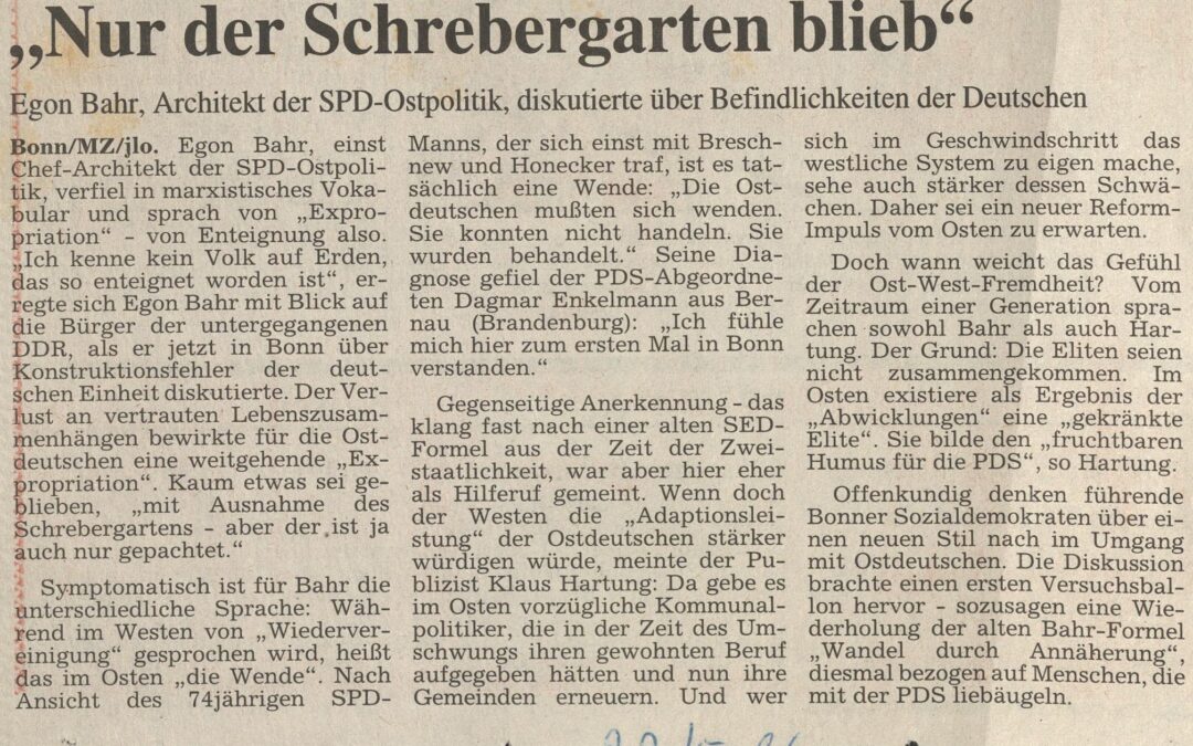 Bonn/MZ/jlo. Egon Bahr, einst Chef-Architekt der SPD-Ostpolitik, verfiel in marxistisches Vokabular und sprach von „Expropriation“ –von Enteignung also. „Ich kenne kein Volk auf Erden, das so enteignet worden ist“, erregte sich Egon Bahr mit Blick auf die Bürger der untergegangenen DDR, als er jetzt in Bonn über Konstruktionsfehler der deutschen Einheit diskutierte. Der Verlust an vertrauten Lebenszusammenhängen bewirkte für die Ostdeutschen eine weitgehende „Expropriation“. Kaum etwas sei geblieben, „mit Ausnahme des Schrebergartens – aber der ist ja auch nur gepachtet.“