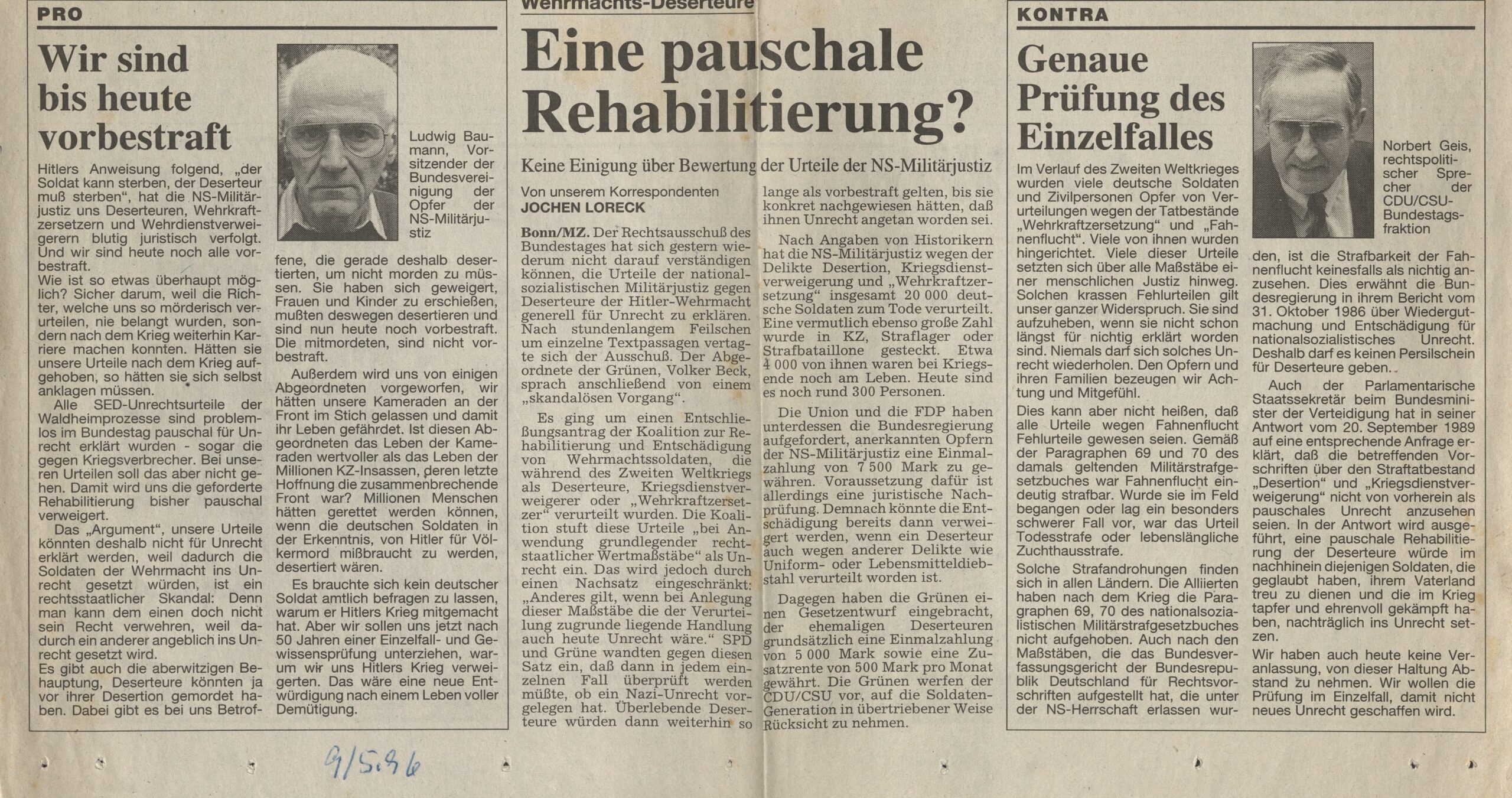 Es ging um einen Entschließungsantrag der Koalition zur Rehabilitierung und Entschädigung von Wehrmachtssoldaten, die während des Zweiten Weltkrieges als Deserteure, Kriegsdienstverweigerer oder „Wehrkraftzersetzer“ verurteilt wurden. Die Koalition stuft diese Urteile „bei Anwendung grundlegender rechtsstaatlicher Wertmaßstäbe“ als Unrecht ein. Das wird jedoch durch einen Nachsatz eingeschränkt: „Anderes gilt, wenn bei Anlegung dieser Maßstäbe die der Verurteilung zugrundeliegende Handlung auch heute Unrecht wäre.“ SPD und Grüne wandten gegen diesen Satz ein, daß dann in jedem einzelnen Fall überprüft werden müßte, ob ein Nazi-Unrecht vorgelegen hat. Überlebende Deserteure würden dann weiterhin so lange als vorbestraft gelten, bis sie konkret nachgewiesen hätten, daß ihnen Unrecht angetan worden sei.