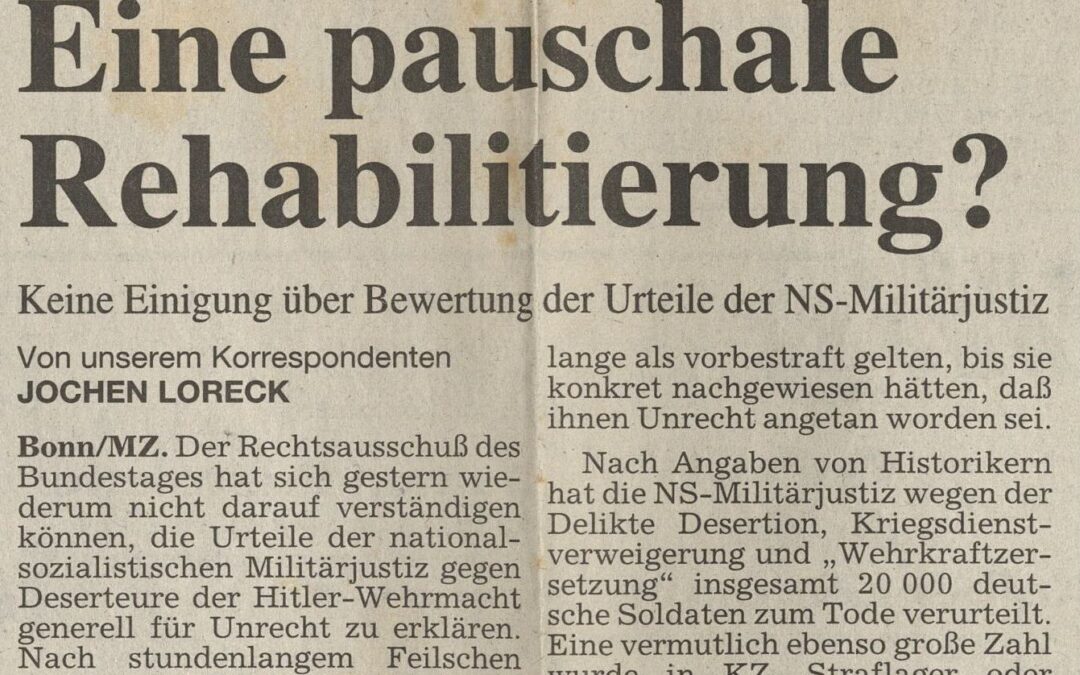 Auch der Parlamentarische Staatssekretär beim Bundesminister der Verteidigung hat in seiner Antwort vom 20.September 1989 auf eine entsprechende Anfrage erklärt, daß die betreffenden Vorschriften über den Straftatbestand „Desertion“ und „Kriegsdienstverweigerung“ nicht von vorherein als pauschales Unrecht anzusehen seien. In der Antwort wird aufgeführt, eine pauschale Rehabilitierung der Deserteure würde im nachhinein diejenigen Soldaten, die geglaubt haben, ihrem Vaterland treu zu dienen und die im Krieg tapfer und ehrenvoll gekämpft haben, nachträglich ins Unrecht setzen.