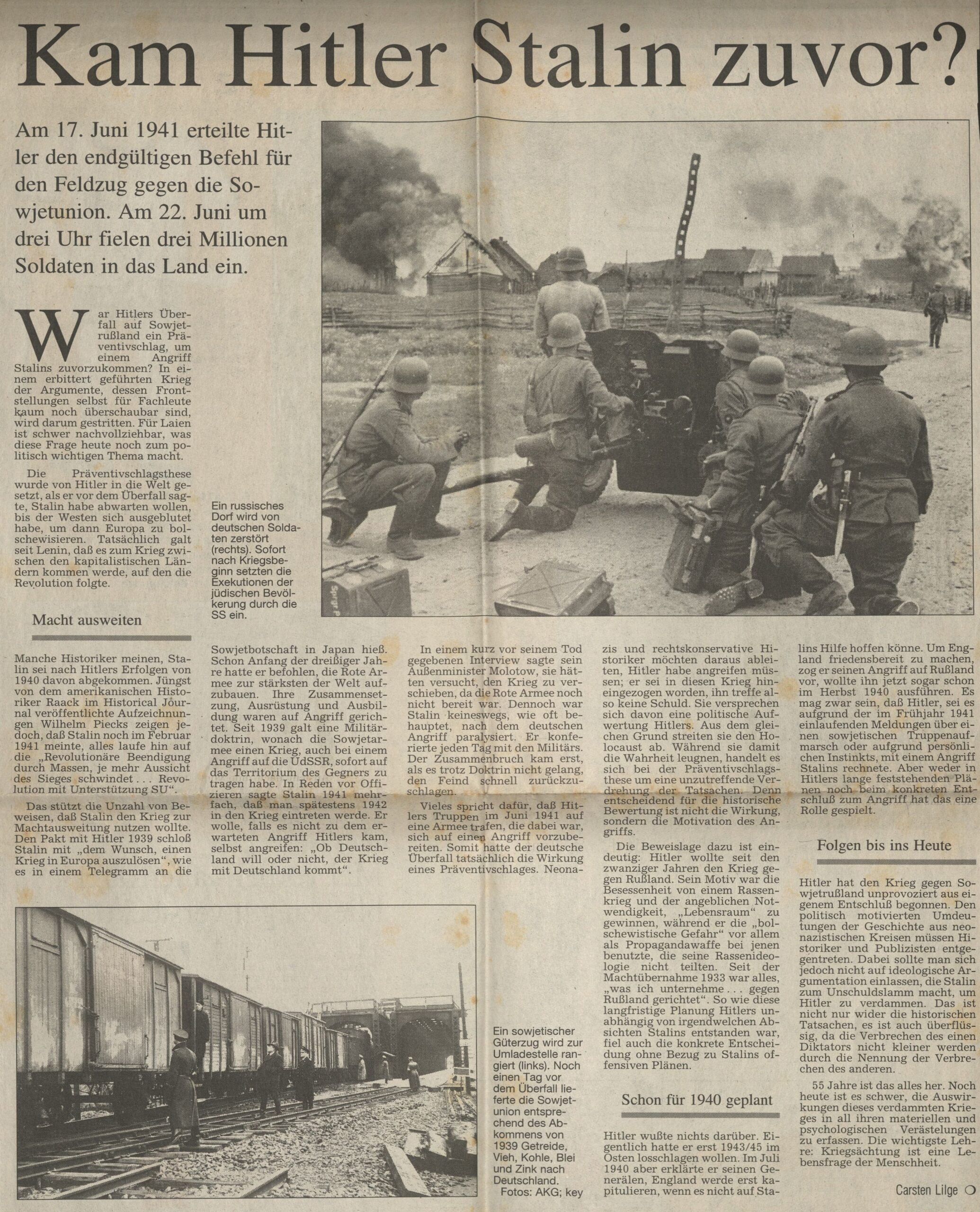 Hitler hat den Krieg gegen Sowjetrußland unprovoziert aus eigenem Entschluß begonnen. Den politisch motivierten Umdeutungen der Geschichte aus neonazistischen Kreisen müssen Historiker und Publizisten entgegentreten. Dabei sollte man sich jedoch nicht auf ideologische Argumentation einlassen, die Stalin zum Unschuldslamm macht, um Hitler zu verdammen. Das ist nicht nur wider die historischen Tatsachen, es ist auch überflüssig, da die Verbrechen des einen Diktators nicht kleiner werden durch die Nennung der Verbrechen des anderen.