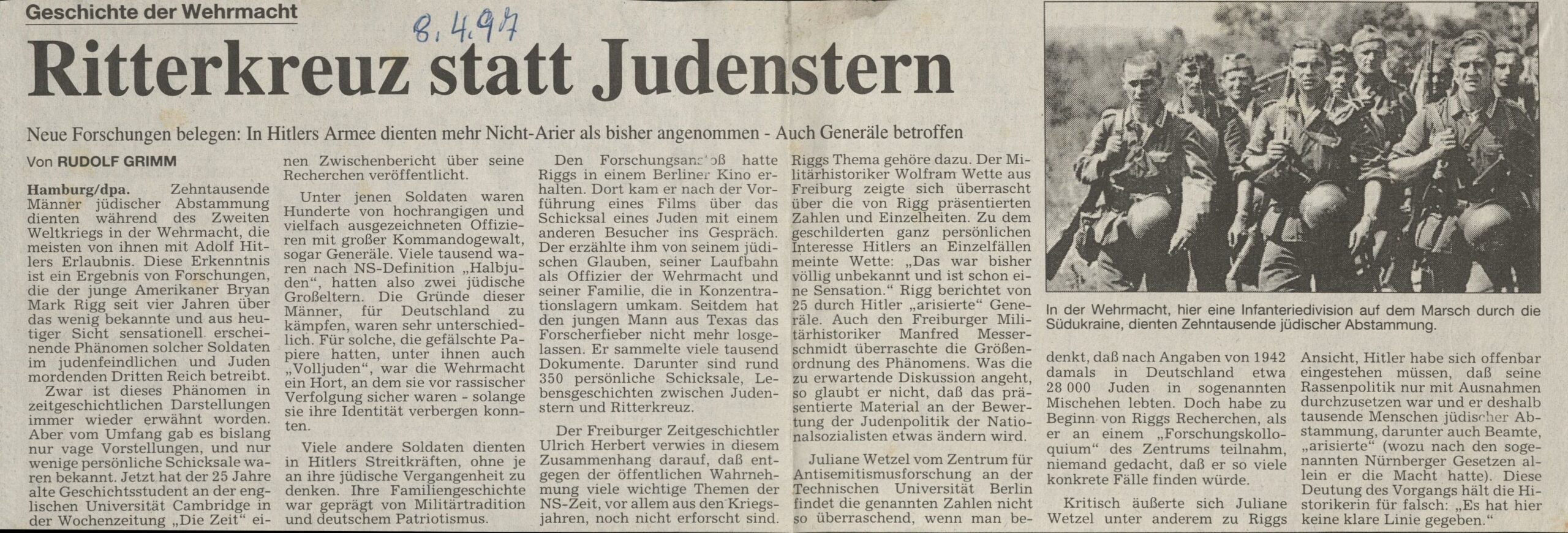 Zehntausende Männer jüdischer Abstammung dienten während des Zweiten Weltkriegs in der Wehrmacht, die meisten von ihnen mit Adolf Hitlers Erlaubnis. Diese Erkenntnis ist ein Ergebnis von Forschungen, die der junge Amerikaner Bryan Mark Rigg seit vier Jahren über das wenig bekannte und aus heutiger Sicht sensationell erscheinende Phänomen solcher Soldaten im judenfeindlichen und Juden mordenden Dritten Reich betreibt.