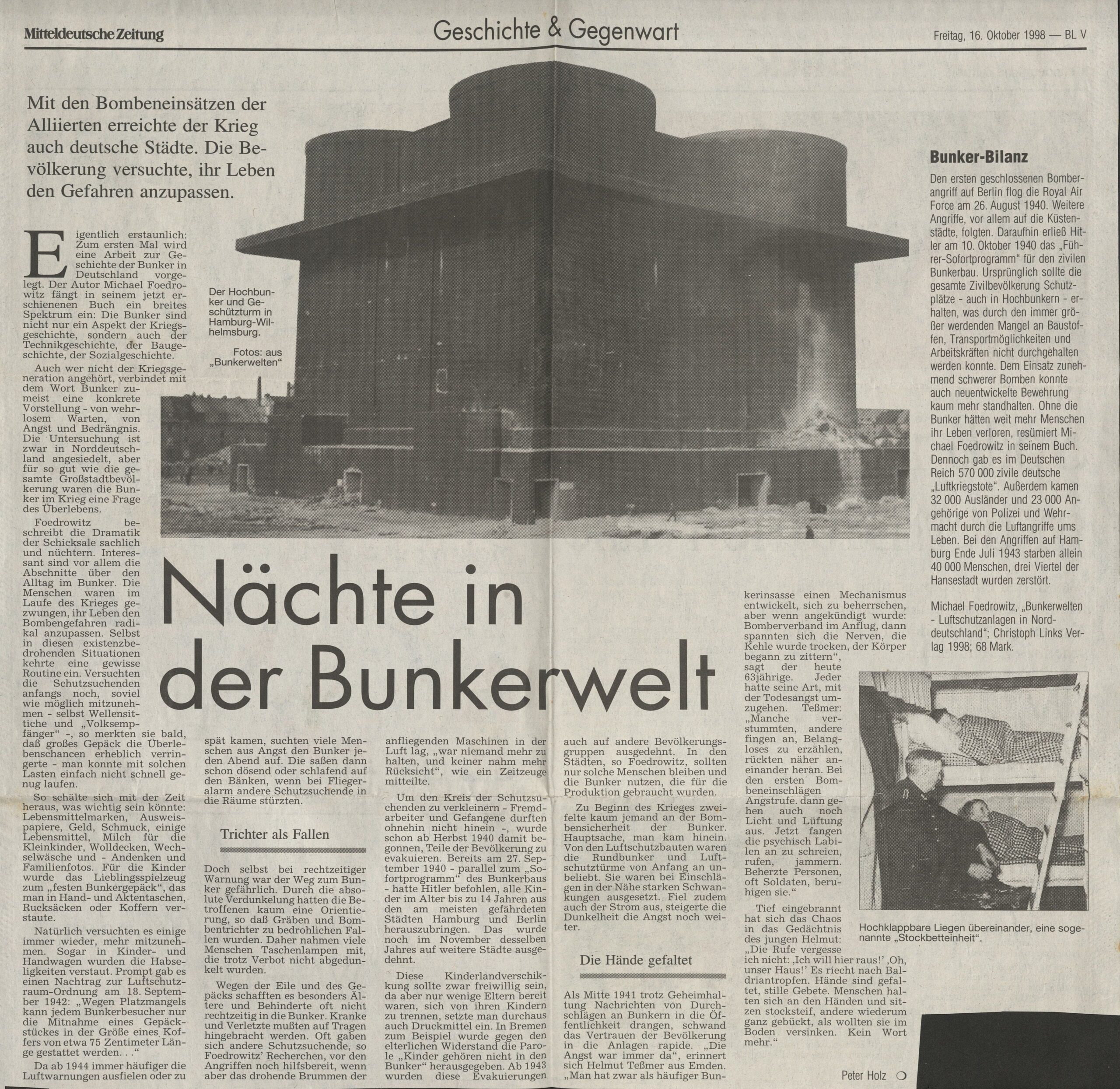 Eigentlich erstaunlich: Zum ersten Mal wird eine Arbeit zur Geschichte der Bunker in Deutschland vorgelegt. Der Autor Michael Foedrowitz fängt in seinem jetzt erschienenen Buch ein breites Spektrum ein: Die Bunker sind nicht nur ein Aspekt der Kriegsgeschichte, sondern auch der Technikgeschichte, der Baugeschichte, der Sozialgeschichte.
