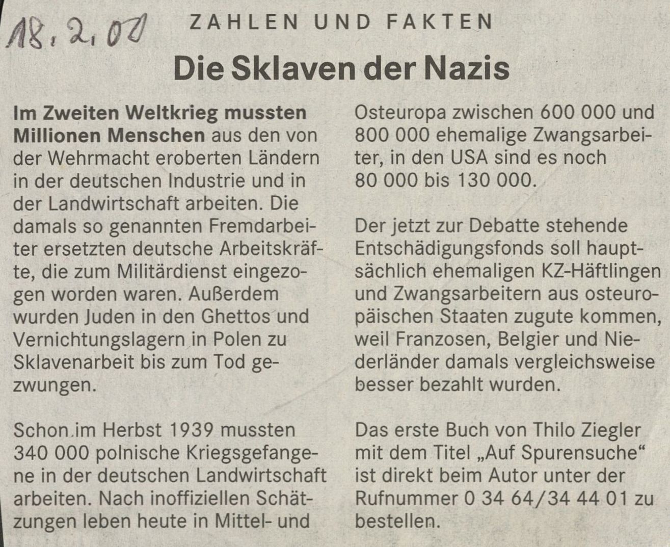 Das erste Buch von Thilo Ziegler mit dem Titel „Auf Spurensuche“ ist direkt beim Autor unter der Rufnummer 0 34 64/34 44 01 zu bestellen.