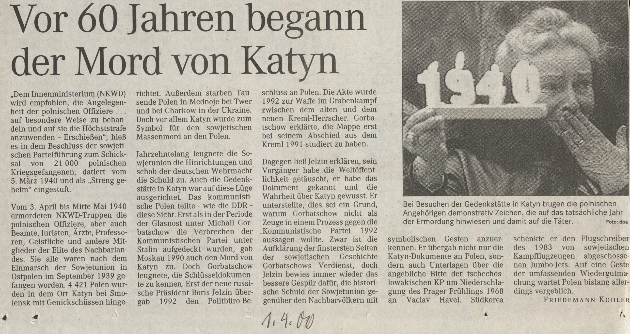 Vom 3. April bis Mitte Mai 1940 ermordeten NKWD-Truppen die polnischen Offiziere, aber auch Beamte, Juristen, Ärzte, Professoren, Geistliche und andere Mitglieder der Elite des Nachbarlandes. Sie alle waren nach dem Einmarsch der Sowjetunion in Ostpolen im September 1939 gefangen worden. 4 421 Polen wurden in dem Ort Katyn bei Smolensk mit Genickschüssen hingerichtet. Außerdem starben Tausende Polen in Mednoje bei Twer und bei Charkow in der Ukraine. Doch vor allem Katyn wurde zum Symbol für den sowjetischen Massenmord an den Polen.