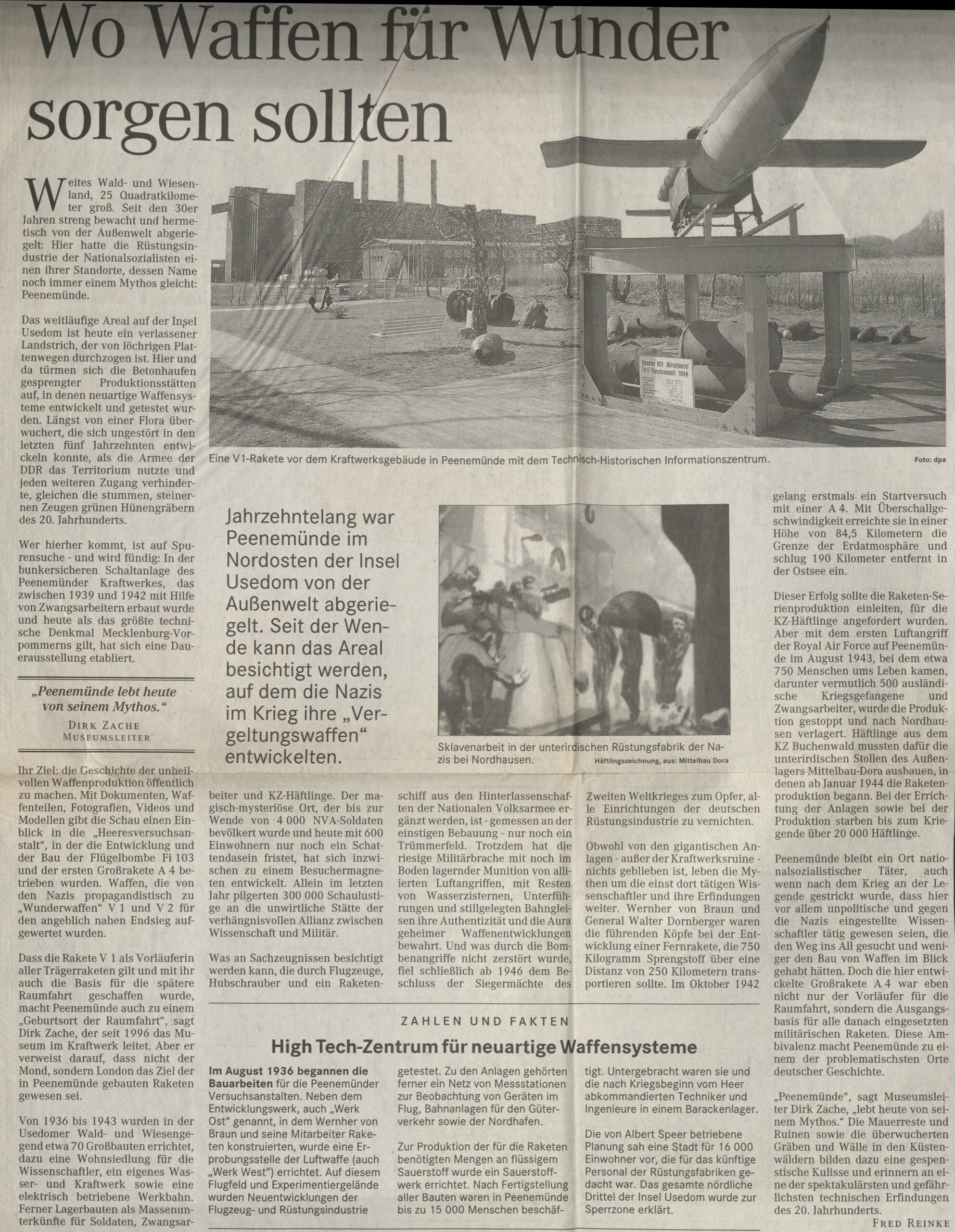 Dass die Rakete V 1 als Vorläuferin aller Trägerraketen gilt und mit ihr auch die Basis für die spätere Raumfahrt geschaffen wurde, macht Peenemünde auch zu einem „Geburtsort der Raumfahrt“, sagt Dirk Zache, der seit 1996 das Museum im Kraftwerk leitet. Aber er verweist darauf, dass nicht der Mond, sondern London das Ziel der in Peenemünde gebauten Raketen gewesen sei.