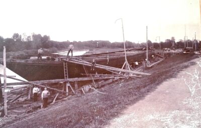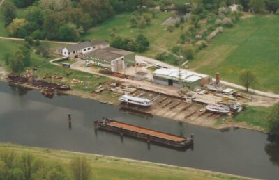 Werft 1993 auf dem westlichenSlip: Neubau „Schenkenland“, auf dem östlichenSlip der abgewrackte Dampfer „Reiher“, dessen Dampfmaschine heute auf dem Deich ausgestellt ist.