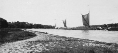 Diese Aufnahme von 1890 zeigt die Placke`sche Werft mit Wassermühlen auf dem Slip und im Wasser einen typischen Kaffenkahn und einen der ersten Maßkähne.