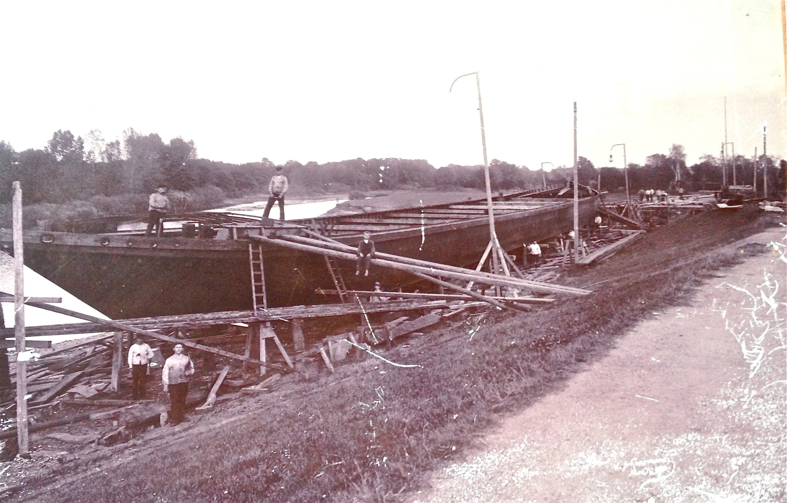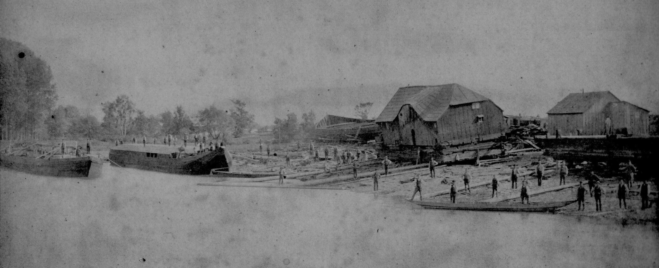 Diese Aufnahme von 1890 zeigt die Placke`sche Werft mit Wassermühlen auf dem Slip und im Wasser einen typischen Kaffenkahn und einen der ersten Maßkähne.
