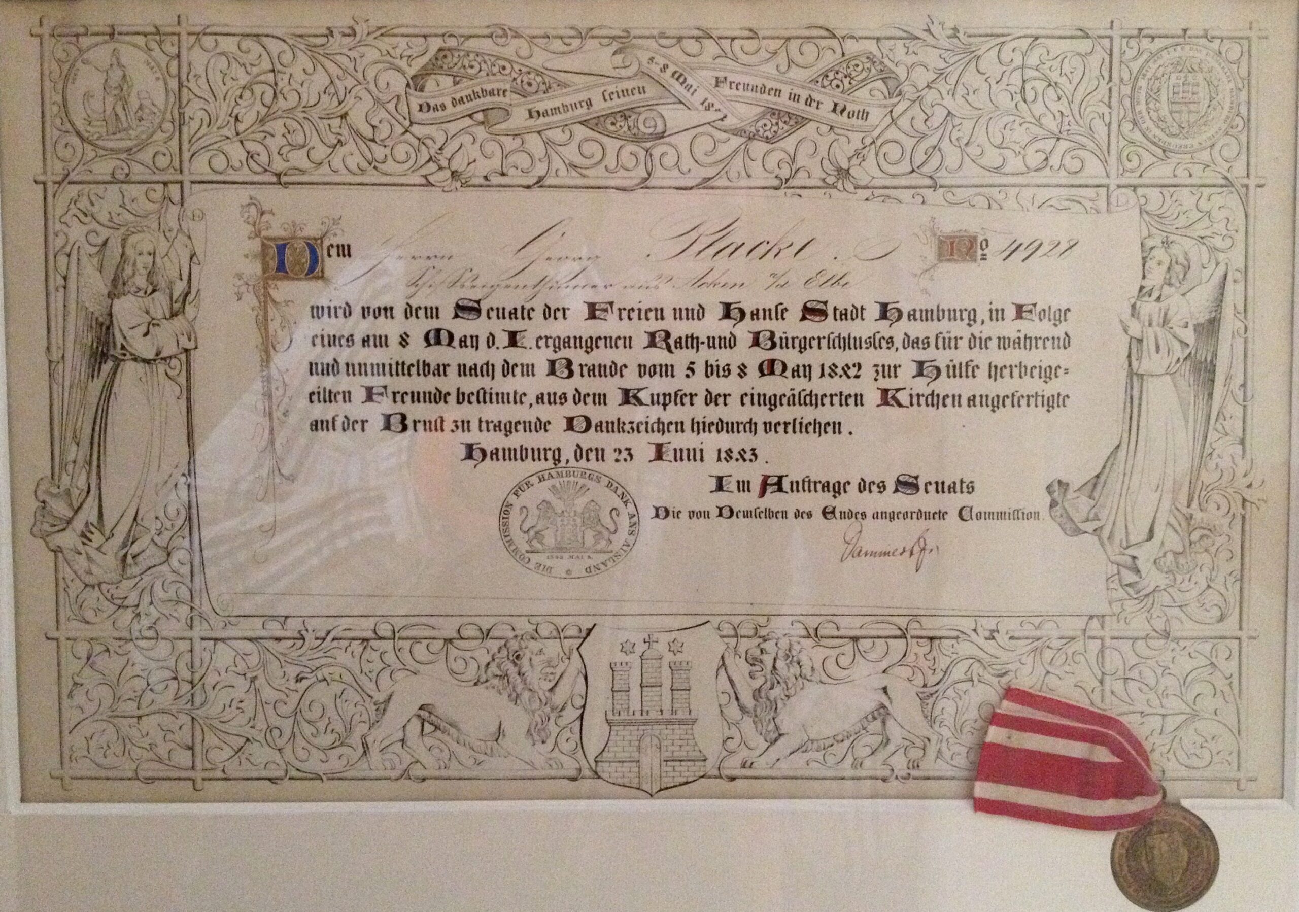 So erhielt er vom Hamburger Senat die Urkunde Nr. 4927 zusammen mit einer Medaille „aus dem Kupfer der eingeäscherten Kirchen“ für seine Hilfe beim grossen Brand von 1842 , welche noch heute in der Familie erhalten ist.