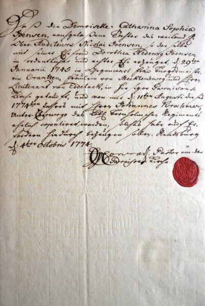 Es war wohl für beide Seiten eine gute Partie. Catharina Sophia gehörte zu einer der etablierten Bürgerfamilien der Stadt: Ihr Vater Nicolai Jöns war Oberauditeur der Garnison, ein juristischer Beamter mit Verantwortung für die militärische Rechtspflege. In der Vorfahrenreihe finden sich Generationen von Schiffern, Brauern und Kaufleuten, darunter ein Vorfahr, der Bürgermeister in Rendsburg gewesen war. Ein junger, geworbener Feldscher aus Württemberg heiratete nicht einfach so in eine solche Familie hinein, er musste sich als vertrauenswürdig erwiesen haben.