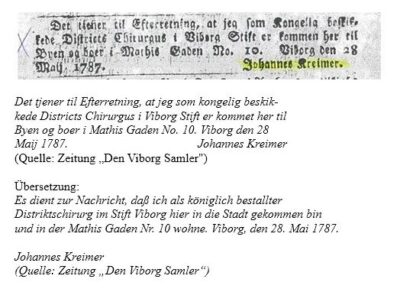 1787 trat Johannes Krämer eine zivile Stellung als Distriktschirurg in Viborg an. In der Zeitung „Den Viborg Samler“ schaltete er eine Anzeige, um seine Ankunft bekannt zu machen: Er teilte mit, dass er als königlich bestellter Distriktschirurg im Stift Viborg in die Stadt gekommen sei und in der Mathis Gaden Nr. 10 wohne. Es ist ein kleines, aber aussagekräftiges Dokument, ein Beamter, der sich seiner neuen Stadt mit Nachdruck und Korrektheit vorstellte.