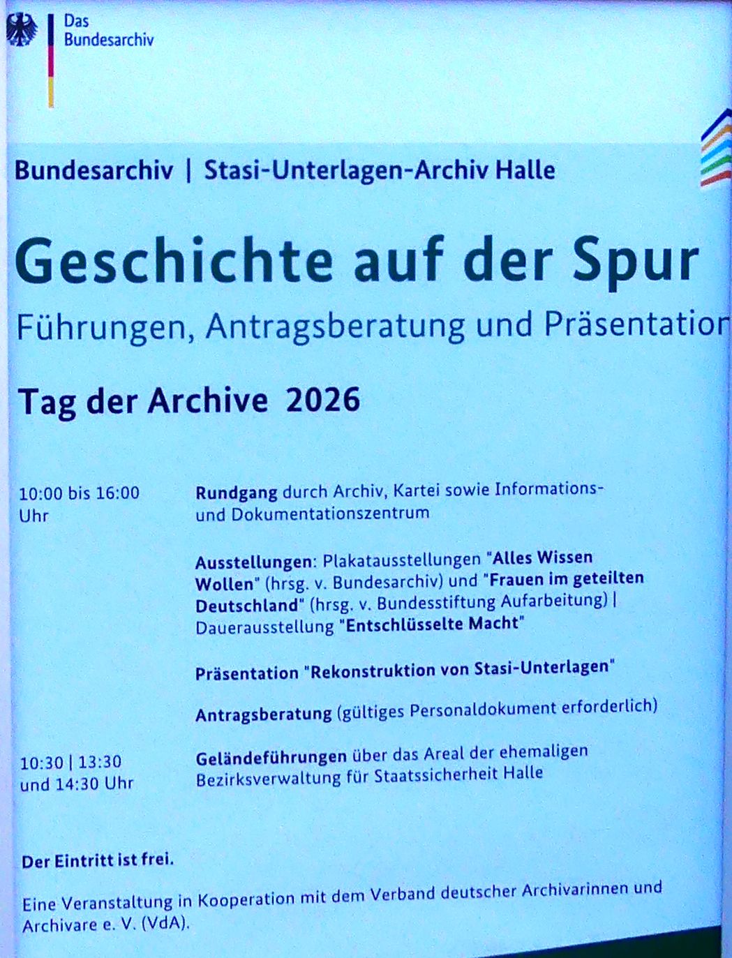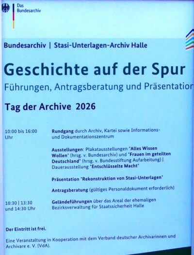 Am ersten Märzwochenende fand bundesweit der Tag der Archive statt. Unter dem diesjährigen Motto „Alte Heimat – neue Heimat“ öffneten zahlreiche Archive ihre Türen und gaben Einblicke in ihre Arbeit. Auch das → Bundesarchiv – Stasi-Unterlagen-Archiv Halle beteiligte sich mit Führungen, Präsentationen und Beratungsangeboten.